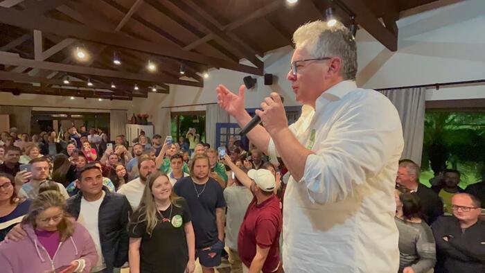 Ele assistiu a apuração em Turvo, município onde mora, acompanhando da família, equipe de campanha e apoiadores. Após a confirmação do resultado das urnas, Tiago Zilli recebeu o carinho e o abraço do público que lotou o Alvorada Clube para parabenizá-lo.