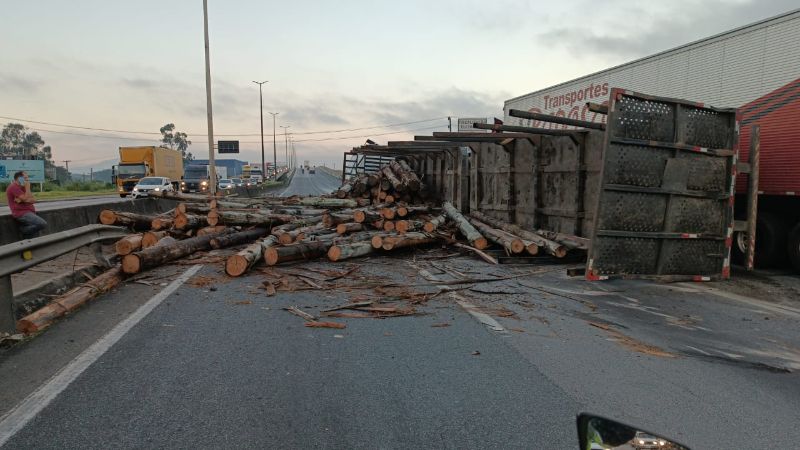 O Km-111,2 da BR-101, em Itajaí, foi bloqueado na manhã desta sexta-feira (31), após o tombamento de uma carreta carregando toras de madeira, no acesso da rodovia pela BR-470.