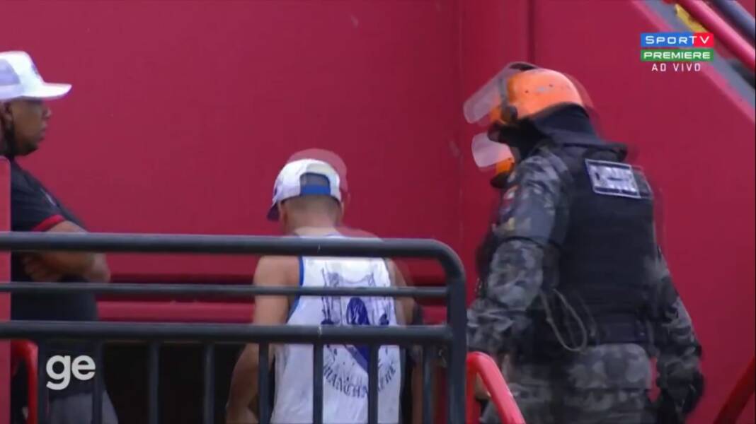 A Brigada Militar foi até a arquibancada, identificou e prendeu o torcedor, que deixou o estádio algemado. Os nomes dos envolvidos não foram divulgados.