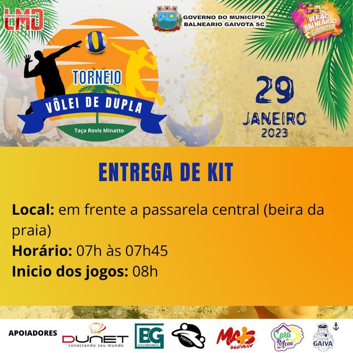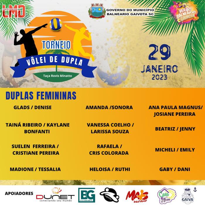 O já tradicional Torneio de Vôlei em Duplas – Taça Rovis Minatto, que foi adiado do dia 15 para 29 de janeiro, superou as expectativas de inscrições neste ano. De acordo com a LMD, organizadora do evento, serão 12 equipes do naipe Feminino e 12 no Masculino. Os jogos serão disputados com início às 8:00h na Arena Beira Mar e a arbitragem será no sistema Fair Play. As duplas participantes receberão o kit atleta entre 7h e 7h45, no local dos jogos. O KIT contem: água, frutas, energético, sacochila (inscrição até dia 06/01), viseira personalizada, açaí, chopp e seguro. A premiação oferecida, além de troféus, será de R$ 300 para o 1º lugar de cada modalidade; R$ 200 para o 2º lugar; R$ 120 para o 3º lugar e R$ 100 reais para o 4º colocado.