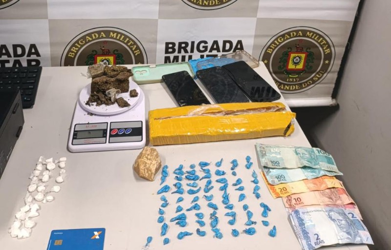 Os policiais decidiram realizar a abordagem depois que o condutor do carro mudou repentinamente de direção ao avistar a guarnição. Durante a revista, foram encontradas com os indivíduos 72 porções de crack, 26 de cocaína, porções grandes de maconha, além de uma balança de precisão, dinheiro e celulares.
