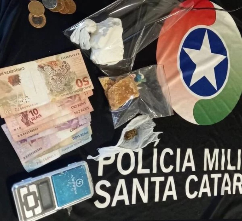 Na casa, estava outro homem e foi encontrada droga no lixo do banheiro, enrolada em uma sacola, dinheiro sobre a mesa e drogas prontas pro comércio, além de balança de precisão.