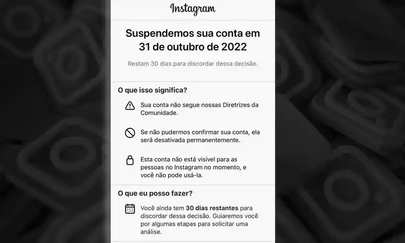 Quem teve a rede suspensa está recebendo mensagens de violação das diretrizes da comunidade. De acordo com o comunicado, os usuários têm até 30 dias para discordar da decisão, caso contrário, o perfil é excluído.