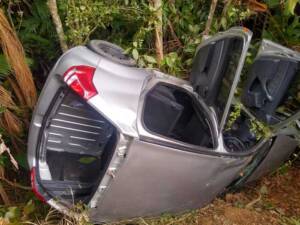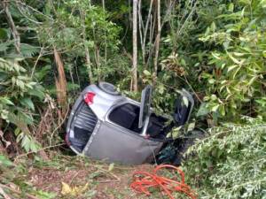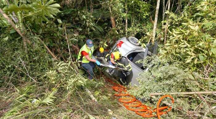 Segundo os bombeiros, o veículo saiu da pista e capotou, ficando lateralizado em uma ribanceira e apoiado em algumas árvores.