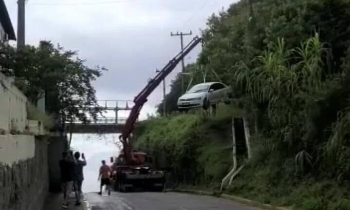 Ainda não sabe em quais circunstâncias, um veículo Jetta foi parar no alto do morro. O carro teve que ser retirado com o auxílio de um guindaste do local.