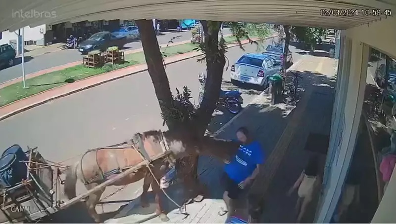 Já o animal que o atacou estava parado preso a uma carroça, atrás de uma árvore.